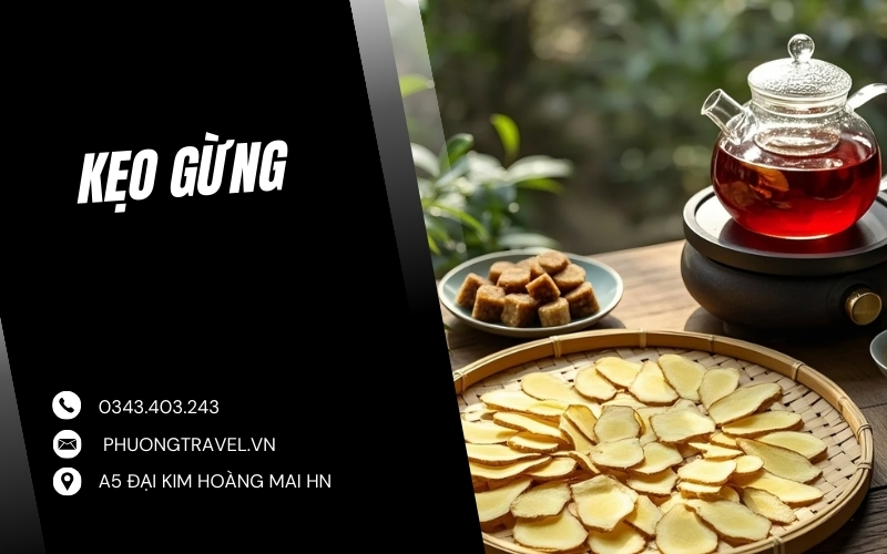 Nguyên liệu khá đơn giản như gừng, đường trắng, đường nâu và vừng nhưng điểm tạo nên khác biệt nằm ở cách làm thủ công: kẹo được nấu, kéo và tạo hình ngay trước mắt du khách. Thành phẩm là những viên kẹo nhỏ xinh, thơm mùi gừng, vị the cay nhẹ nhưng hậu ngọt dễ chịu. Vì đóng gói gọn gàng và giữ được lâu nên kẹo gừng vô cùng thích hợp để bạn mua làm quà cho bạn bè hay gia đình sau chuyến du lịch.