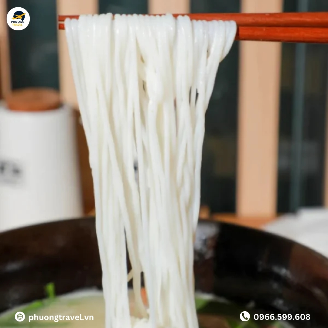 Bún gạo Mông Tự: loại sợi tròn, trắng, dai nhẹ, được làm từ gạo địa phương.
