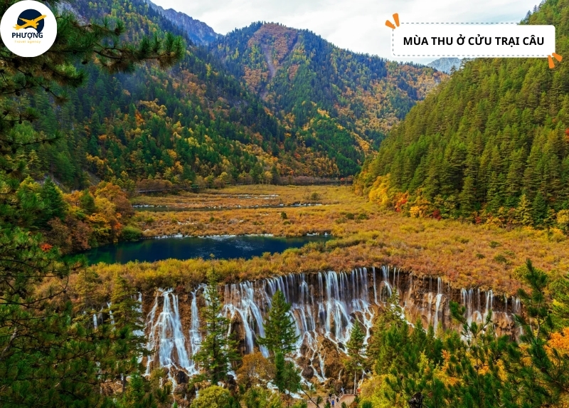 Mùa thu ở Cửu Trại Câu thường bắt đầu từ cuối tháng 9 và kéo dài đến tận tháng 11, lúc này cả thung lũng khoác lên mình chiếc áo rực rõ đẹp nhất trong năm. Những cánh rừng phong, cây dương, và vô số loài thực vật thay nhau đổi màu tạo nên bức tranh hoà sắc đỏ – vàng- cam đầy mê hoặc. Dưới ánh sáng dịu nhẹ ban ngày, từng tán lá trở nên lung linh khiến cả không gian thêm lãng mạn và tràn đầy sức sống. Đây chính là thời khắc mà bất kỳ du khách nào cũng muốn một lần được đặt chân đến để cảm nhận vẻ đẹp trong trẻo và cuốn hút của miền tiên cảnh này.