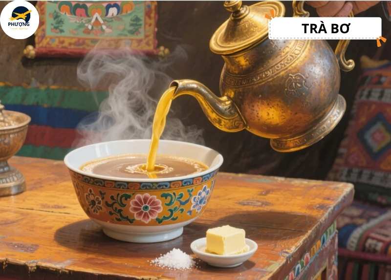 Trà bơ Tây Tạng là loại thức uống đặc trưng được pha từ trà đặc, bơ và một chút muối. Với hương vị béo mặn lạ miệng nhưng rất ấm giúp cơ thể nhanh chóng hồi phục năng lượng khi thời tiết vào thu trở lạnh.