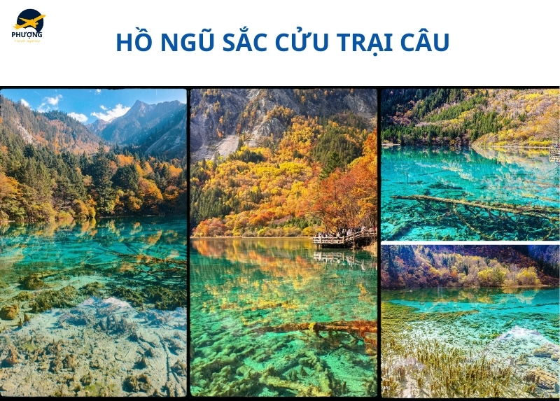Giữa hơn 100 hồ nước lớn nhỏ, Hồ Ngũ Sắc là địa điểm nổi bật được nhiều người thích thu chiêm ngưỡng khi tới Cửu Trại Câu. Dù chỉ sâu khoảng 5m, mặt hồ lại trong đến mức bạn có thể thấy những thân cây cổ thụ nằm yên dưới đáy như bức tranh trầm mặc. Lúc này rừng cây xung quanh chuyển sắc, màu nước xanh lam, xanh lục và ánh vàng của hồ hoà cùng sắc đỏ lá vàng mang đến cung cảnh thiên nhiên rực rỡ. Chính vì vậy nơi đây được xem như viên ngọc quý, khiến cho du khách nhất định dừng chân lưu giữ những bức ảnh đẹp.