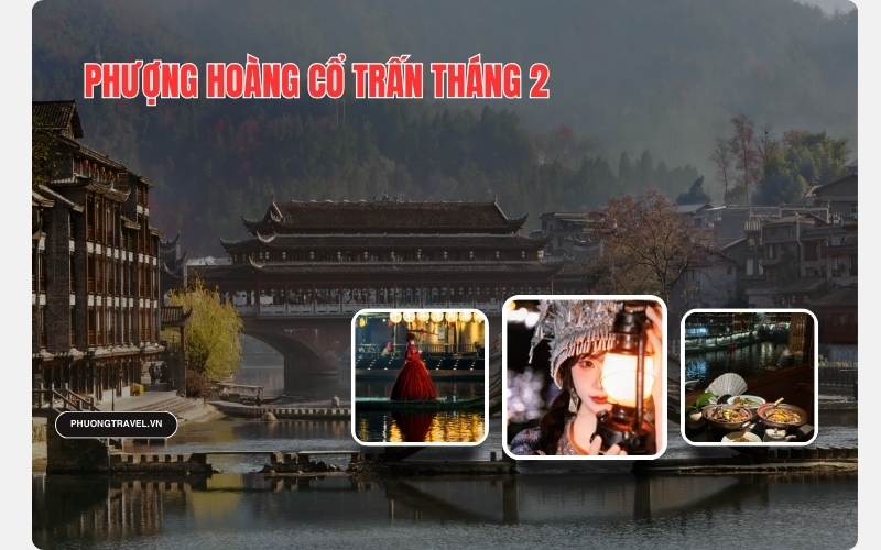 Tháng 2 ở Phượng Hoàng Cổ Trấn là giai đoạn giao mùa với thời tiết se lạnh nhưng dễ chịu hơn hẳn với nhiệt độ dao động khoảng 3–12°C. Ban ngày, nắng nhẹ xuất hiện xen kẽ len qua những mái ngói âm dương và phản chiếu xuống dòng Đà Giang êm đềm khiến khung cảnh phố cổ càng thêm trong trẻo, lãng mạn. Sáng sớm và chiều tối, cổ trấn chìm trong sương mờ phủ nhẹ mang đến cảm giác huyền ảo như đang bước vào bức tranh thuỷ mặc phù hợp cho những ai yêu thích nhiếp ảnh và trải nghiệm nhịp sống yên bình.