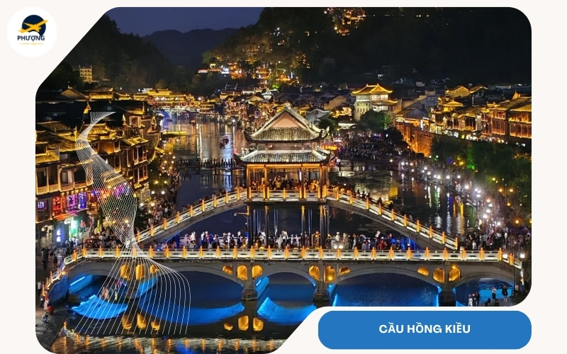 Cầu Hồng Kiều nổi bật với kiến trúc mái che đặc trưng và vị trí ngay trung tâm. Nơi đây không chỉ là điểm giao thương mà còn là nơi check in của các du khách khi ghé thăm Phượng hoàng cổ trấn vào tháng 10. Đứng trên cầu bạn hoàn toàn có thể ngắm trọn khung cảnh phố cổ hai bên bờ sông. Khi chiều xuống ánh đèn bắt đầu thắp sáng khiến cả khu vực nơi đây thêm lung linh và đậm chất thơ.