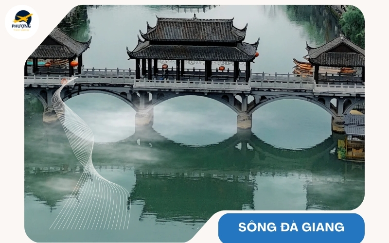 Ngồi thuyền xuôi dòng Đà Giang là trải nghiệm không thể thiếu khi đến đây. Khi ngồi trên con thuyền gỗ nhỏ lướt nhẹ qua những nhịp cầu cổ và dãy nhà sàn soi bóng xuống mặt nước xanh biếc. Tháng 10, hai bên bờ sông phủ đầy sắc vàng của lá ngô đồng và phản chiếu xuống mặt nước tạo nên khung cảnh đối xứng tuyệt đẹp. Cảm giác thả mình giữa không gian yên bình ấy giúp bạn cảm nhận rõ nhịp sống chậm rãi, nhẹ nhàng của Phượng Hoàng Cổ Trấn.