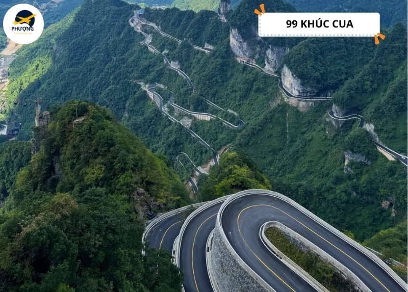 Cung đường 99 khúc cua quanh sườn Thiên Môn Sơn được mệnh danh là những tuyến đường ngoạn mục và hiểm trở nhất ở thế giới. Cung đường này có độ dài gần 11km uốn lượn quanh núi đá vôi tạo nên 99 khúc cua liên tiếp. Nơi đây tượng trưng cho 9 tầng trong văn hoá của Trung hoa cổ đại. Nhìn từ xa tuyến đường như con rồng trắng khổng lồ đang uốn mình giữa trời mây. Du khách trải nghiệm cung đường này như thử thách của bản lĩnh và sự tập trung khiến cho hành trình trở nên kịch tích và nhiều kỷ niệm khó quên.