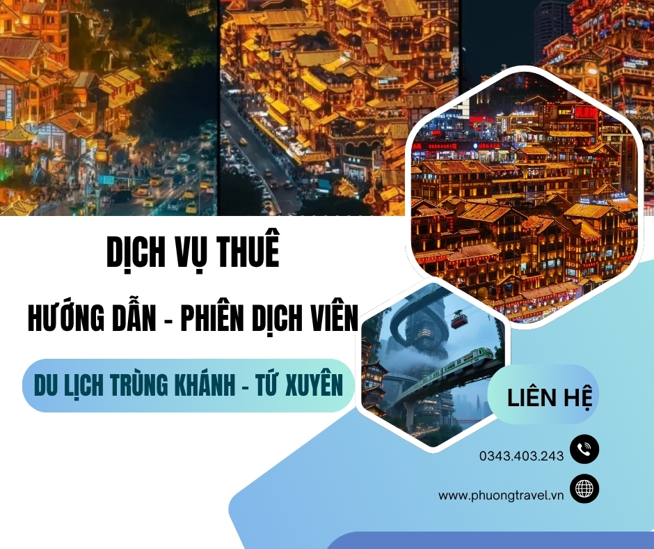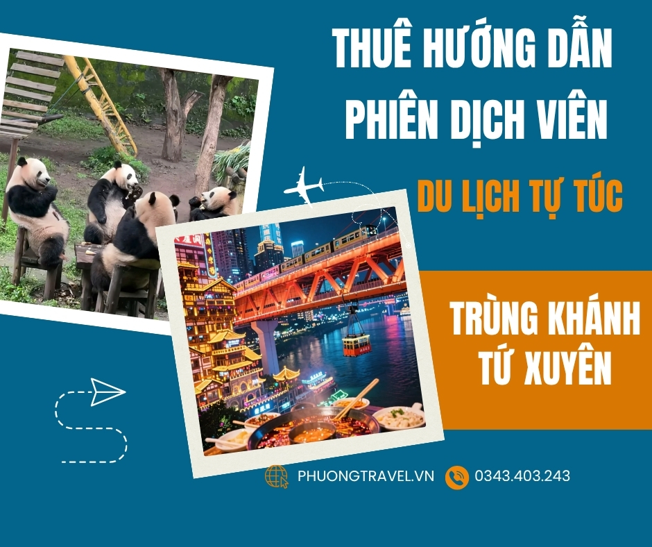 Nếu bạn đang lên kế hoạch du lịch tự túc Trùng Khánh – Tứ Xuyên cùng gia đình bạn bè hay hội nhóm để tận hưởng hành trình trọn vẹn an toàn hiệu quả. Dịch vụ thuê hướng dẫn viên kiêm phiên dịch viên tiếng Trung của nhà Phượng Travel chính là lựa chọn lý tưởng dành cho bạn. Với kinh nghiệm am hiểu văn hóa – địa lý – ẩm thực Trung Hoa, đội ngũ phiên dịch viên chuyên nghiệp sẽ giúp bạn trọn vẹn khám phá những góc phố cổ, sông Dương Tử hùng vĩ, cây cầu Hồng Nhai nổi tiếng, và khu cổ Từ Khí Khẩu rực rỡ ánh đèn. Du cho bạn đi công tác du lịch tự túc thì dịch vụ phiên dịch viên của chúng tôi sẽ giúp bạn giao tiếp dễ dàng tiết kiệm chi phí và tận hưởng hành trình đầy trải nghiệm đáng nhớ.