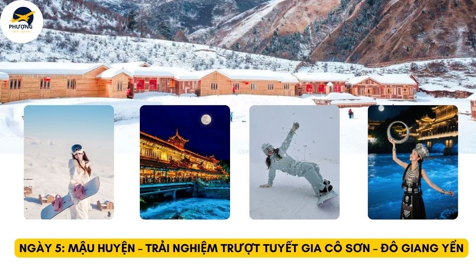 Điểm nhấn đặc biệt của Tour đó là trải nghiệm trượt tuyết Gia Cô Sơn nổi tiếng tại Tứ Xuyên. Đến đây du khách có cơ hội hoà mình trong không gian tuyết trắng phủ kín núi rừng hay thử những hoạt động trượt tuyết thú vị và tận hưởng mùa đông đầy lãng mạn.