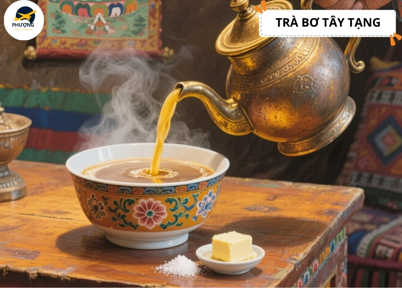 Khi đến du lịch Vân Đài Sơn, bạn sẽ thường gặp những tách trà bơ truyền thống được bán đầy đường. Loại trà này được pha từ bơ Yak và muối tạo nên hương vị thơm ngon khó cưỡng và giúp giữ ấm cơ thể và bổ sung năng lượng. Vị trà hơi béo ngậy và có độ mặn khi uống một tách trà nóng giữa sương núi lạnh sẽ khiến bạn có cảm giác ấm áp đúng chuẩn trải nghiệm ẩm thực Tây Tạng.